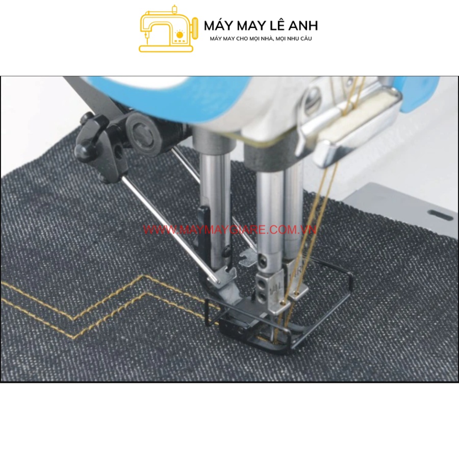 Máy may 2 kim hiệu Jack JK-58750B-005 ổ lớn là dòng máy 2 kim tự động chặt góc, may được hàng dày như Jean, hàng da, bao bì loại dày,…